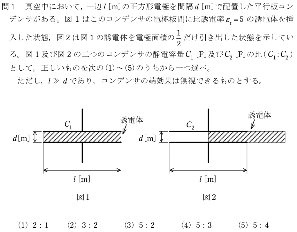誘電率を挿入したコンデンサの静電容量の問題です。(平成15年問2と同じ問題ですが、与えられた数値が違います)