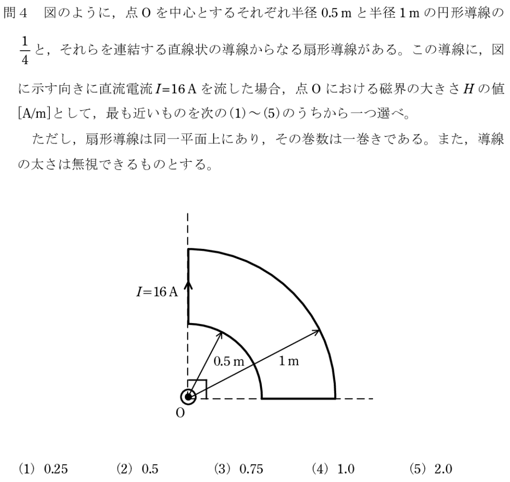点Oから0.5m離れた扇形導線の磁界の大きさH1は、r=0.5、I=16Aより「円形コイルの磁界」の式の1/4で以下となります。