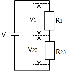 回路の電圧はVなので「直列回路(直流)」の電圧の式より、各抵抗の電圧V1、V23を求めます。