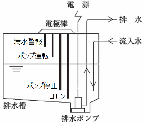 電極に液体が接触し、コモン(アース)と、そこに流れる電流によって液体の水位を検出する。高置水槽の揚水ポンプの発停や、排水槽の排水ポンプの発停の信号として使用する。